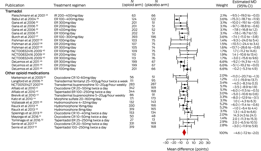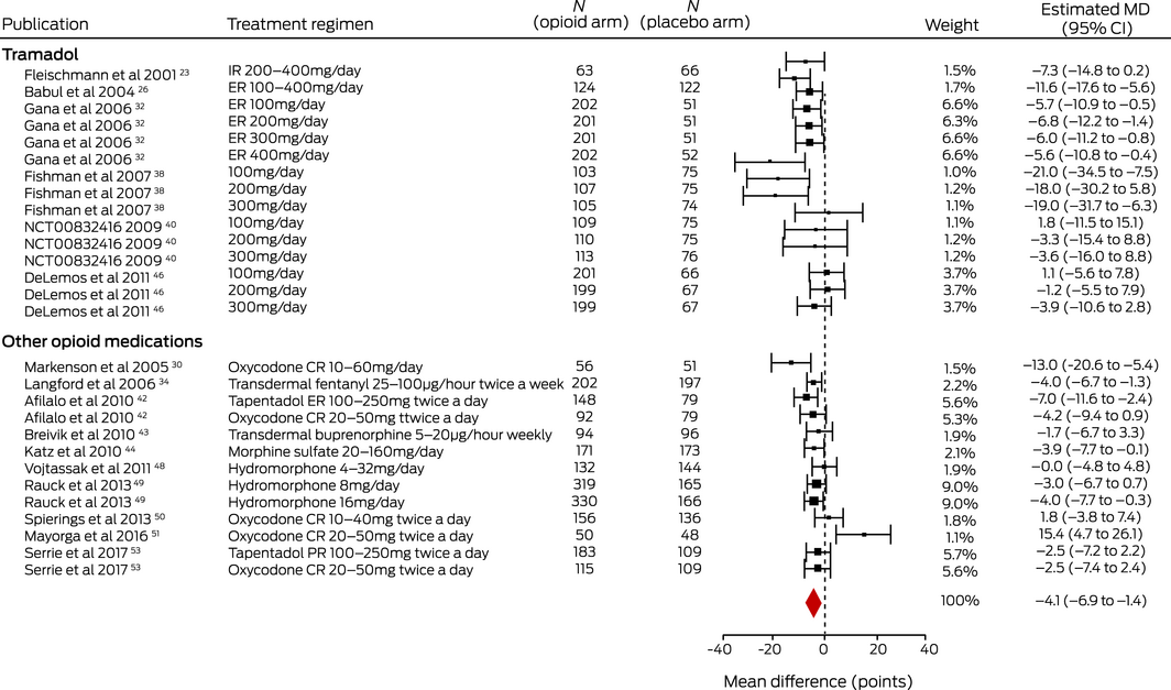 The included studies evaluated oral or transdermal opioid analgesic medications (modified release formulations) for people with osteoarthritis, chiefly of the knee, hip, or both. The opioid analgesics evaluated were tramadol, oxycodone, tapentadol, hydromorphone, codeine, buprenorphine, fentanyl, oxymorphone, tramadol/acetaminophen, oxycodone/acetaminophen, and ibuprofen/codeine; five studies evaluated transdermal buprenorphine or fentanyl.34,35,36,43,45 Doses ranged from 10 to 210 MME per day, treatment duration from one day (200 mg ibuprofen/30 mg codeine, for hip osteoarthritis) to 12 weeks; 15 studies18,19,20,21,22,24,25,28,29,31,33,35,39,41,45 reported treatment durations of four weeks or less, with regular (ie, not “when required”) regimens (Supporting Information, tables 3 and 6).