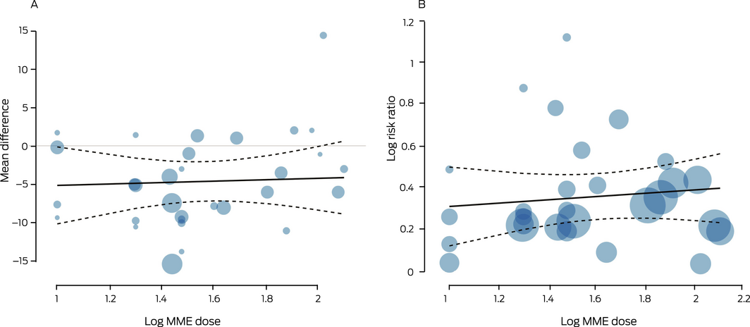 *Each circle represents an eligible comparison in the included publications (the number of comparisons exceeded the total number of publications for each outcome); circle size is proportional to sample size. The dashed lines encloses the 95% confidence region. The regression equations are: Y = –6.0 + 0.92*log(MME dose) (A); Y = 0.23 + 0.08*log(MME dose) (B). ♦
