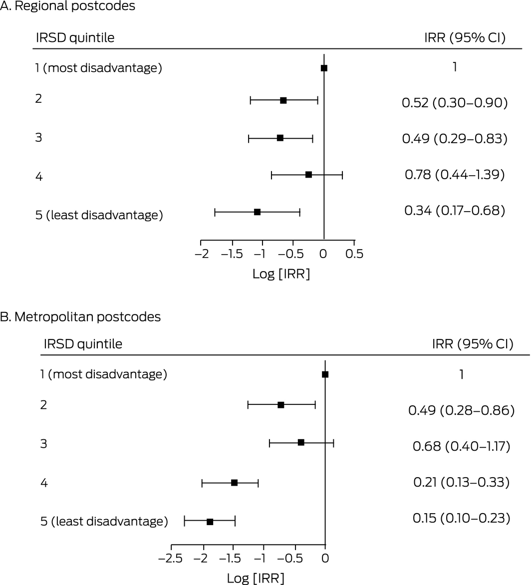 In metropolitan postcodes, the incidence of SARS‐CoV‐2 infections increased with the proportion of the population who were Aboriginal or Torres Strait Islander people (per percentage point: IRR, 1.91; 95% CI, 1.10–2.73); in regional areas, the likelihood of zero infections increased with the proportion of Indigenous Australians (IRR, 1.62; 95% CI, 1.20–2.20) (Box 3).