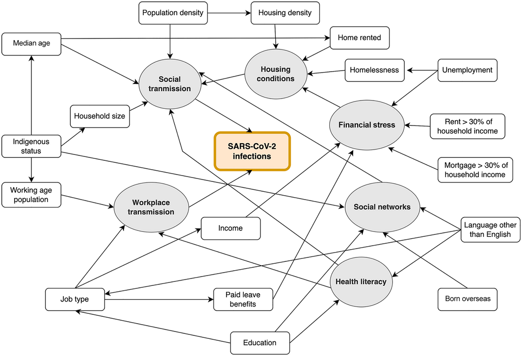 Box 7 depicts our basic conceptual model of the complex interactions between socio‐economic factors that can influence the incidence of SARS‐CoV‐2 infections. Despite the limitations these interactions place on defining the influence of individual factors, the associations we found our consistent with differences in job security, access to paid sick leave, affordable housing, and health care that affect people from culturally and linguistically diverse communities and younger people, to a greater extent than other people. Disseminating timely and effective health advice to people in areas with larger proportions of migrants and people from non‐English speaking backgrounds, where the incidence of SARS‐CoV‐2 infections was higher, is a major challenge during a pandemic.