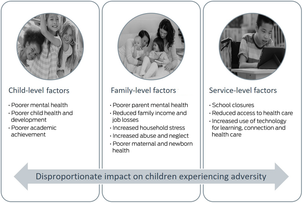 Children are facing a “generation‐defining disruption”1 from the coronavirus disease 2019 (COVID‐19) pandemic. To date, the direct health impacts of the severe acute respiratory coronavirus 2 itself have been relatively minimal for children globally, even with the Delta variant.2,3,4,5 In Australia, infections have been relatively low compared with other countries because of our strict public health restrictions (Box 1). However, these restrictions are having immediate and likely longer term adverse consequences on children’s developmental potential,11,12,13,14,15 with the impacts likely to be more severe if we do not consider the necessary policy responses as we emerge from the pandemic.1,16,17,18 While there are also positive impacts, such as population‐level resilience and rapid improvements in telehealth,19,20 our review focuses primarily on potential adverse impacts. There is likely to be a disproportionate impact on children experiencing adversity (eg, socio‐economic disadvantage),18,21 and potential for the widening of existing disparities in child health and developmental outcomes.3,17,22,23