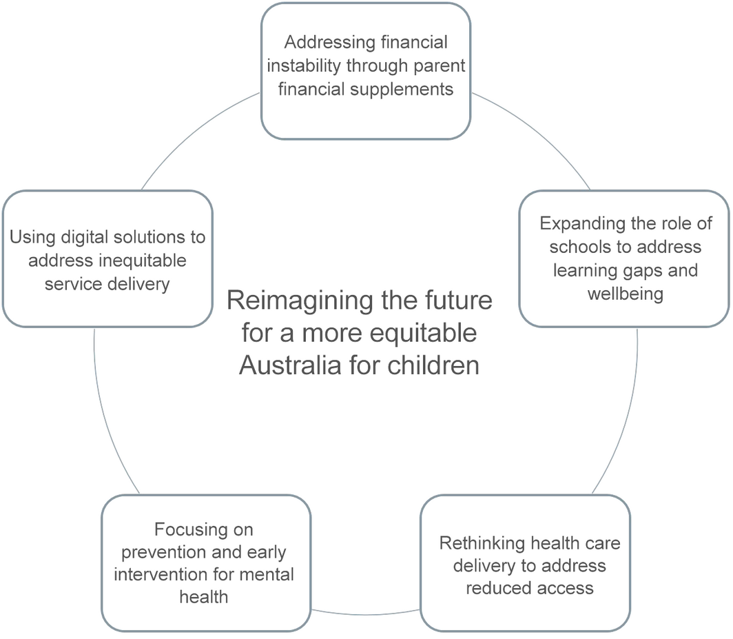 The indirect impacts of COVID‐19 and related policy responses will likely have broad, long‐lasting implications for children. History shows us that children already experiencing adversity lose out the most,22 with the potential for widening health inequities.119 The international body of literature emerging from the COVID‐19 pandemic suggests that now is the time to not only repair the past, but to start to re‐imagine the future for a more equitable Australia for children. The COVID‐19 pandemic has highlighted that it is possible to make transformational changes that could deliver on community child health aspirations. We have the opportunity to build a better and more equitable Australia, for the children of today and the adults of the future.17