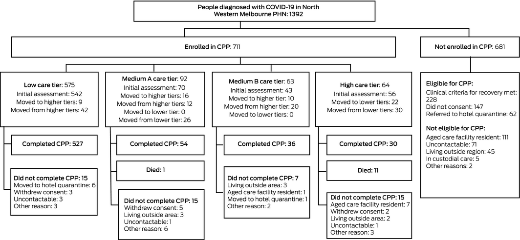 Conclusions: The COVID Positive Pathway is a feasible multidisciplinary, tiered model of care for people with COVID‐19. About 80% of participants could be adequately supported by primary care and community organisations, allowing hospital services to be reserved for people with more severe illness or with risk factors for disease progression. The principles of this model could be applied to other health conditions if regulatory and funding barriers to information‐sharing and care delivery by health care providers can be overcome.