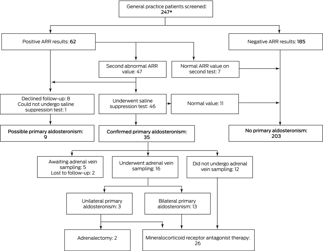 We contacted 80 GP practices; 31 agreed to participate: 29 in Greater Melbourne and two in regional Victoria. The median practice size was ten GPs (interquartile range [IQR], 7–13 GPs). Seventy GPs recruited patients for the study; six recruited more than ten patients each, 34 recruited one patient each. A total of 256 patients were screened during March 2017 – November 2020, of whom nine were excluded because they were not treatment‐naïve; 62 of 247 eligible patients (25%) had initial positive screening results (ARR ≥ 70 pmol/mU) (Box 1, Box 2).