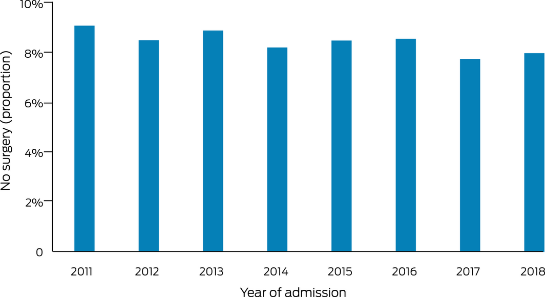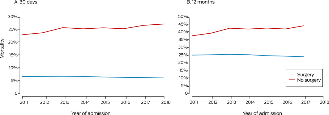 The proportion of patients who did not undergo surgery declined from 9.1% in 2011 (5218 patients) to 8.0% in 2018 (4656 patients; PAC, –1.9%; 95% CI, –3.5% to –0.4%) (Box 1). Unadjusted 30‐day mortality, overall and by surgery group, was unchanged across the study period (data not shown). After adjusting for age, sex and comorbidity, 30‐day mortality declined from 8.4% in 2011 to 8.1% in 2018 (PAC, –2.3%; 95% CI, –3.9% to –0.7%). As the interaction between surgery group and year was statistically significant, we estimated separate models for the surgery and no surgery groups; among patients who underwent surgery, mortality declined from 6.9% in 2011 to 6.4% in 2018 (PAC, –3.0%; 95% CI, –4.7% to –1.2%), but the rate for those who did not undergo surgery did not decline significantly (PAC, –2.6%; 95% CI, –6.4% to 1.0%). Changes in adjusted 12‐month mortality were similar: overall decline, from 26.6% in 2011 to 26.0% in 2017; PAC, –2.3% (95% CI, –3.5% to –1.0%); surgery group, –2.8% (95% CI, –4.1% to –1.5%); no surgery group, 3.7% (95% CI, –0.3 to 7.8%) (Box 2).