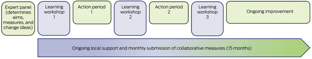 Collaboratives are designed to achieve large‐scale rapid improvement.7 They bring together teams from multiple organisations to focus on improving a change topic. An expert reference panel determines aims, measures, and change ideas. Teams meet in central workshops to learn about the topic, learn improvement skills, plan changes and share ideas. Between workshops, teams receive local support to carry out rapid improvement cycles and measure change in their own organisations. The dominant model is the Breakthrough Series championed by the Institute for Healthcare Improvement (Box),7 which has been used in many systems around the world.