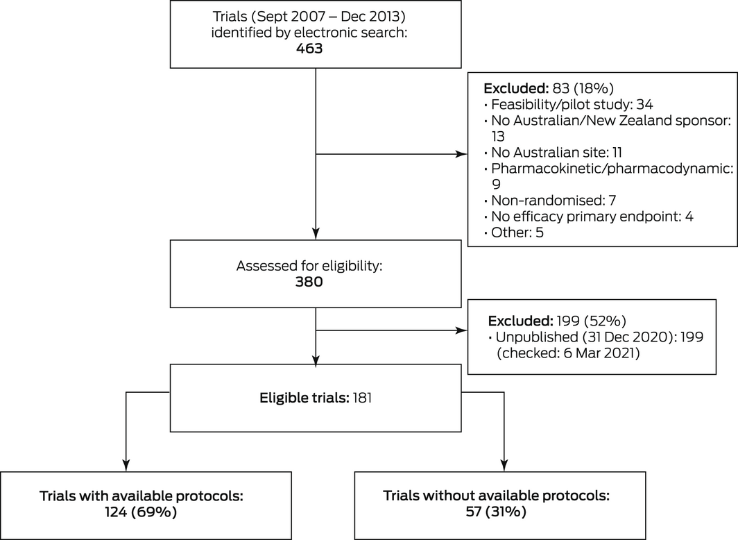 We searched the ANZCTR for phase 3 RCTs registered during 1 September 2007 – 31 December 2013 (ie, the trial phase was specified as 2/3, 3, or 3/4, or was unspecified but planned recruitment was at least 60 participants) with Australia listed as a country of recruitment. This interval was selected because it corresponded to the introduction of the ANZCTR history function, which allows tracking of changes in registration details since August 2007, and to allow time for trial completion and the publication of final outcomes. We excluded studies incorrectly registered as phase 3 trials (eg, pilot studies, pharmacokinetic or pharmacodynamic studies) and those that did not report specific primary efficacy outcomes, those without an Australian or New Zealand sponsor or Australian site, and studies without published primary results (to 31 December 2020) identified by searching PubMed, Scopus, ResearchGate (https://www.researchgate.net), PubFacts (https://www.pubfacts.com), Google Scholar (https://scholar.google.com), Google, and the websites of the pertinent host institutions and coordinating centres.