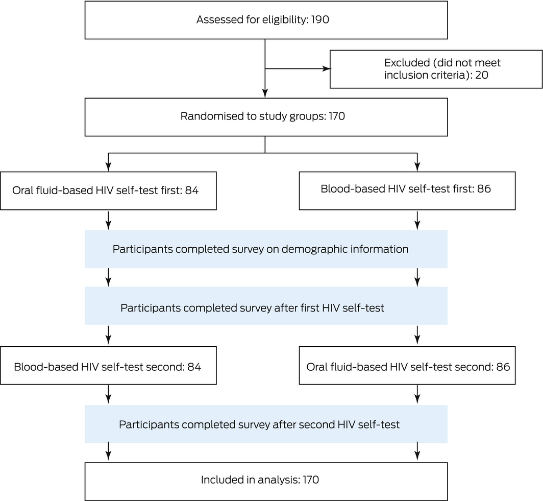 For our non‐blinded, randomised crossover trial, phase 2 of the Preferences and Usability of self‐test kits for HIV among gay and bisexual men (PUSH) study,20 we recruited participants who attended two publicly funded sexual health clinics in Melbourne and Sydney during 7 January – 10 December 2019. Men aged 18 years or more were eligible if they had ever previously had sex with a man, but were excluded if they reported living with HIV, could not speak or read English, could not provide informed consent, or could not meet all study requirements. Eligible participants were provided with an information sheet, and the research nurse explained the study procedures. Those who agreed to participate provided written consent. Our study complied with the 2010 CONSORT statement extension to randomised crossover trials.21