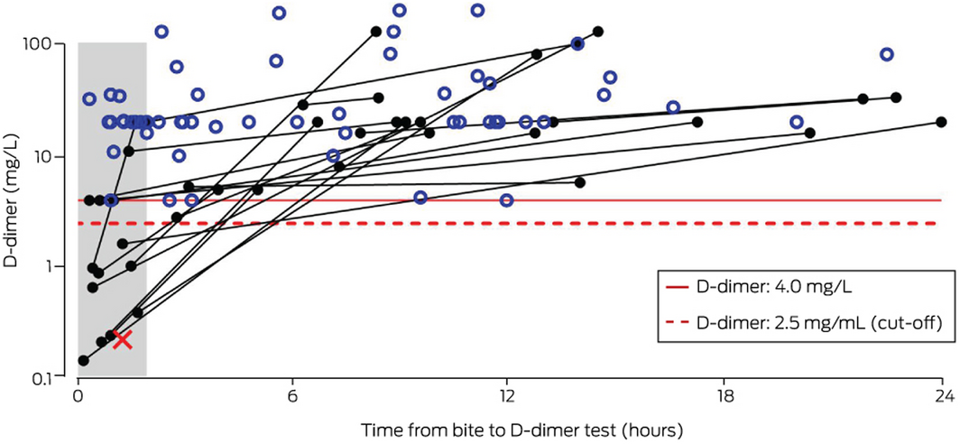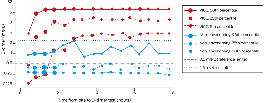 To determine whether elevated D‐dimer concentration might serve as an early diagnostic marker of VICC, we reviewed data for snakebite cases collected prospectively by the Australian Snakebite Project (ASP).2 The ASP recruits people with suspected or confirmed snakebite at more than 200 hospitals across Australia. Cases are notified to the ASP by local hospital investigators, by the National Poisons Information Centre Network, directly to ASP investigators via a national free call number (1800 676944), and by clinical toxicologists. ASP coordinators fax the treating hospitals patient information sheets, consent forms, and datasheets. For patients who consent to participation, hospital investigators report by fax the demographic characteristics of the patients and information on the circumstances of the bite, its clinical effects, laboratory investigations, complications, and treatments. Missing data are extracted from hospital medical or pathology result records, as needed. All data are entered into a relational database (Microsoft Access) and are reviewed by the chief investigator (GKI). Blood samples are routinely collected from patients during their hospital stay and are frozen for subsequent laboratory analysis.