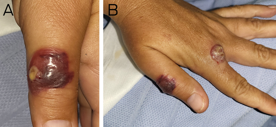 An otherwise well 45‐year‐old sheep farmer presented to her general practitioner following a one‐week history of tender reddish‐blue nodules on the dorsal surface of her left hand (Figure, A and B). She reported accompanying mild fevers and features consistent with regional lymphangitis. She wore fabric gloves for animal handling and could not recall recent contact with any sick animals. Polymerase chain reaction (PCR) testing of lesional fluid confirmed parapox virus and orf infection was diagnosed. Orf is a viral zoonotic cutaneous infection that is contracted via sheep and goats. It is highly contagious and transmission to humans occurs through direct contact with an infected lesion on an animal or contaminated equipment.1,2 The lesions typically resolve spontaneously without sequelae with standard wound care over several weeks. Referral for occupational health and safety advice may be considered.1,2