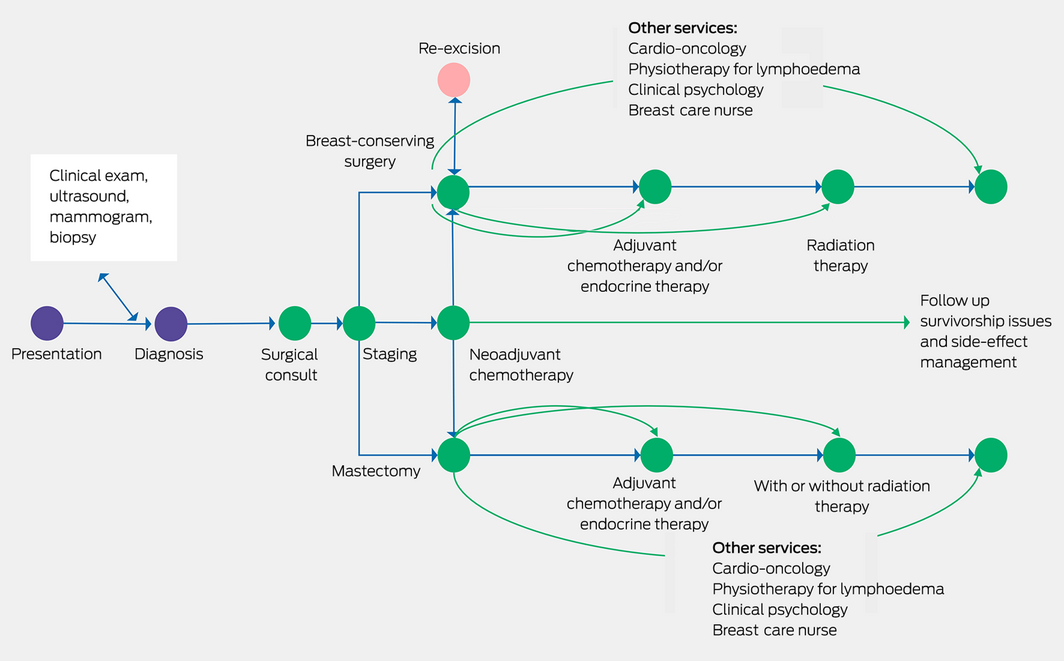 Surgical management, within the context of multidisciplinary care, is the mainstay of breast cancer therapy, and perhaps for the majority of patients it is likely curative in itself, although most will have adjuvant radiotherapy and drug treatments (Box).4 Unfortunately, to date, we have no precise way to predict who could avoid further non‐surgical treatment. Australian research has been in the forefront of the move to develop more targeted therapies, de‐escalating unnecessary and potentially toxic treatments, such as the EXPERT trial, which is identifying who can avoid radiotherapy,5 or the TARGIT trial of a single dose of intraoperative radiotherapy.6 Surgery is not practised in isolation but relies on a large team of health professionals, with the patient at the centre, and vital roles played not just by the cancer clinicians but notably by breast care nurses, allied health professionals and general practitioners.
