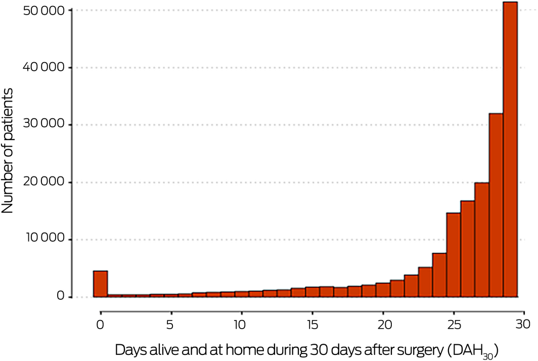 The number of days alive and at home during the 30 days following surgery (DAH30) has been validated as a surgical outcome measure in several countries.9,12,13 In a Swedish study, lower DAH30 was associated with patients at higher medical risk, more complex surgical procedures, and serious post‐surgical complications.9 The 12‐month risk of death was seven times as high for people with DAH30 of eight or fewer days as for other patients.9 DAH30 captures the impact of peri‐operative complications, including those not otherwise detected or reported in routine hospital data, such as complications that develop after discharge from hospital.