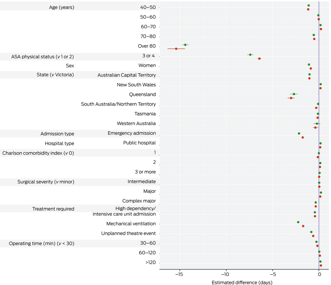 As our quantile regression analysis indicates, the decline in DAH30 with patient age is not linear, but accelerates markedly for people older than 70 years of age. The effect of surgery duration for patients in the highest DAH30 quartile was similarly non‐linear. Median DAH30 declined with patient age, the number and severity of comorbid conditions, and declining functional status, and was also lower for women. Surgical factors associated with lower DAH30 included more extensive or emergency surgery, surgery duration longer than two hours, unplanned return to the operating theatre, high dependency or intensive care unit admission for 24 hours or more, and post‐surgical mechanical ventilation for 24 hours or more. The directions of the covariate effects were consistent with clinical experience, providing compelling evidence for face and construct validity, and consistent with other studies.9,13,25 The differences in DAH30 highlight the cumulative physical deconditioning and economic cost associated with post‐surgical complications in people at high medical risk.