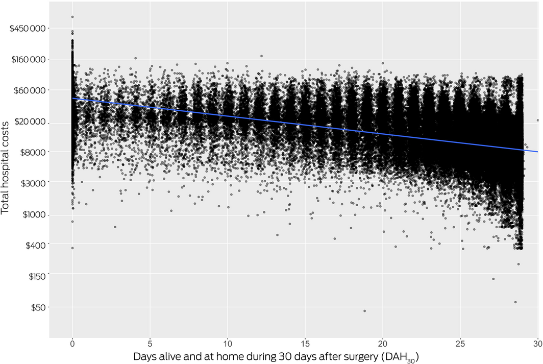 Results: Complete data were available for 126 788 of 181 281 eligible patients (69.9%); their median age was 62 years (IQR, 47–73 years), 72 872 were women (57%), and 115 117 had undergone elective surgery (91%). The median DAH30 was 27.1 days (IQR, 24.2–28.8 days), the median hospital cost per patient was $10 358 (IQR, $6624–20 174). The association between DAH30 and total hospital costs was moderate (Spearman ρ = –0.60; P < 0.001). Median DAH30 declined with age, comorbidity score, ASA physical status score, and surgical severity and duration, and was also lower for women.