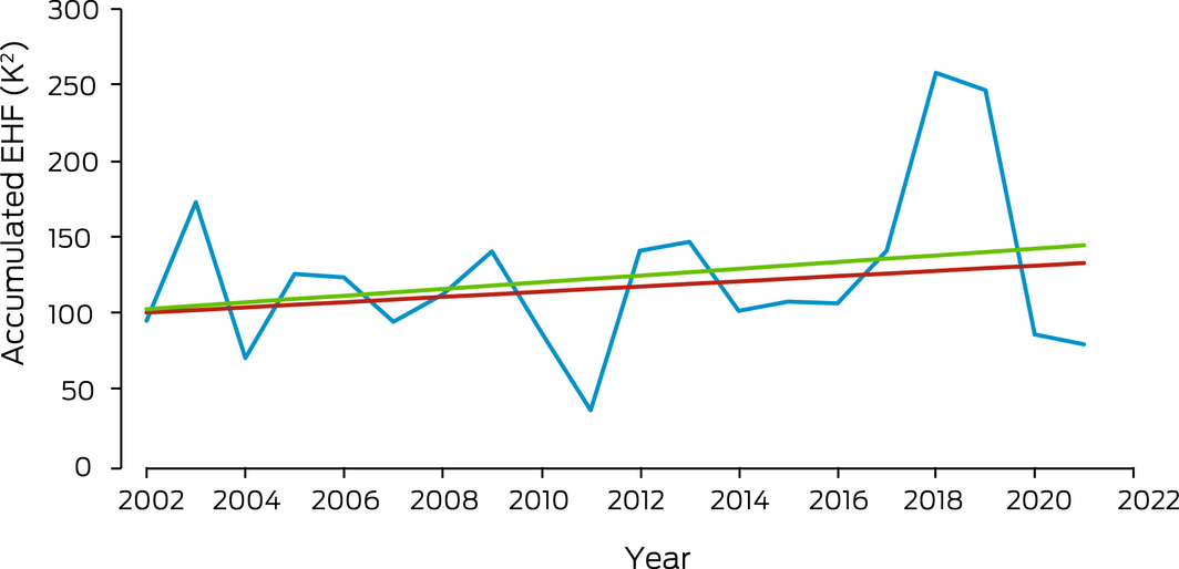 In recent years, multiple studies have demonstrated the effects of heatwaves on excess ambulance demand, hospital admissions and mortality in several sites across Australia.34,35 This indicator tracks change in a measure of heatwave intensity — the excess heat factor — as it applies to human health.36,37 The excess heat factor is based on 3‐day‐averaged daily mean temperatures. Box 3 shows the Australian averaged accumulated excess heat factor over the past 20 heatwave seasons (November–March). It also shows two trends through these data (the 20 years presented, and a longer 50‐year trend extending from 1972–1973 to 2021–2022). The 50‐year trend enables an assessment of long term change, which demonstrates a 32% increase in excess heat factor over this 20‐year period. The trend through just the 20 years presented enables an understanding of the accelerated rate of shorter term change, with a 41% rise seen over the past 20 heatwave seasons. Weighting the accumulated excess heat factor according to the population density produces a similar result, with the 50‐year and 20‐year heatwave season accumulated excess heat factor rise being 26% and 27%, respectively (Supporting Information 1.1). These concerning increases in heatwave exposure in Australia will be harming health, particularly that of those most vulnerable such as people aged over 65 years, with underlying diseases, and living in urban areas.