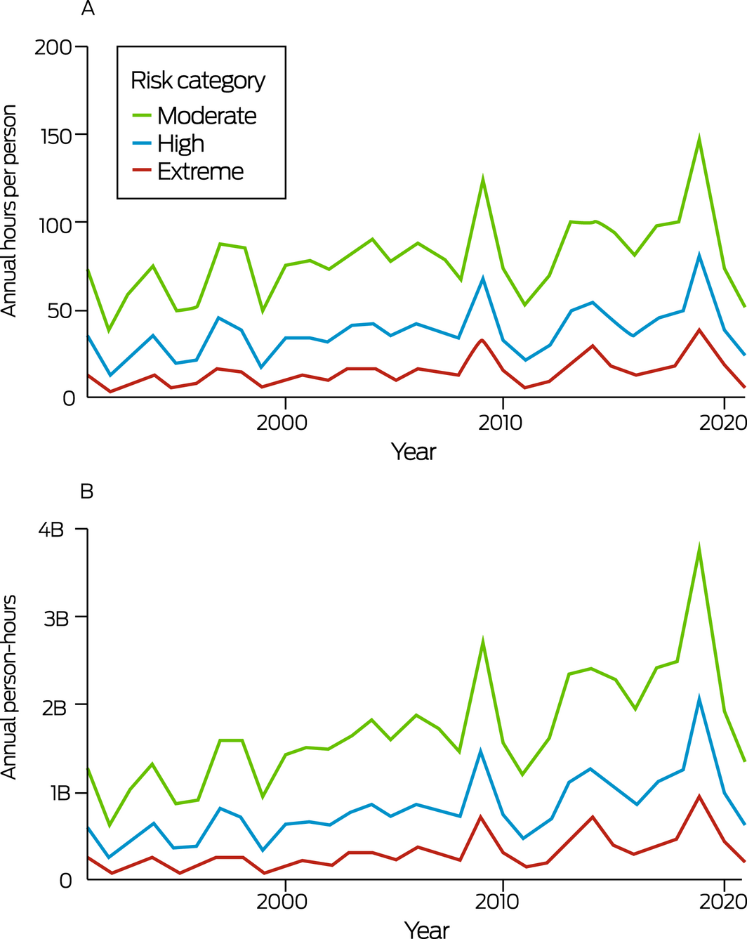 Across Australia, conditions in 2021 led to 1.32 billion, 0.60 billion, and 0.18 billion person‐hours above the moderate, high and extreme heat stress risk threshold, respectively (Box 4). This equated to 50.5 (moderate), 22.9 (high) and 6.9 (extreme) hours above these thresholds per person in 2021. Relative to a historical 5‐year average (1991–1995 inclusive), the number of person‐hours above the moderate, high and extreme risk threshold was, respectively, 0.275 billion, 0.125 billion and 0.015 billion higher in 2021. Because 2021 was a relatively cooler La Niña year, these differences were primarily driven by increases in the Australian population. However, when comparing the most recent 5‐year average (2017–2021 inclusive) to the 5‐year average between 1991 and 1995, the average number of hours per person above the moderate, high and extreme heat stress risk threshold increased by 34.1 (+ 57%), 20.1 (+ 75%), and 10.3 (+ 109%) hours per person per year.