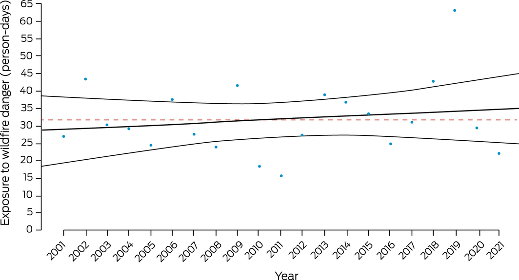 Bushfires affect population health through direct exposure to fire, exposure to bushfire smoke, and the mental trauma associated with proximity to a fire front and loss of home or business and associated forced relocation.40 Population exposure to landscape fire activity is determined from satellite observations available since 2003 (Supporting Information 1.3). This demonstrates that fire activity in Australia has remained below the historically anomalous, climate‐driven, extreme peak of 2019–202041 (Supporting Information, figure A1). This year we have included a new indicator of population exposure to very high or extreme fire danger, defined as a risk index of 5 or 6 on a 6‐point scale provided by the Copernicus Emergency Management Service for the European Forest Fire Information System.42 These data are in keeping with an overall upward trend in population exposure to more extreme fire danger conditions (Box 5).