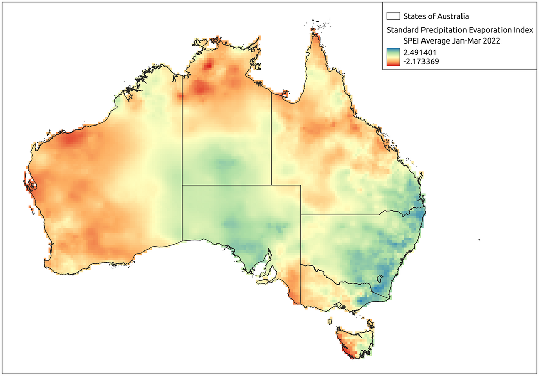 Drought and flood are real and immediate threats to many people in Australia, with Australia experiencing a record‐breaking drought and fire season in 2019–2020, followed by substantial reversion to an extreme wet period, resulting in catastrophic flooding in some jurisdictions in eastern Australia in 2022. The extent of extreme precipitation (drought and severe wet periods) is defined here using the standardised precipitation evapotranspiration index (SPEI). This measure is based on monthly rainfall and temperature to reflect the combined effects of water availability and evaporative potential. This indicator is then summarised to measure excess drought occurrence compared with an average baseline climate (1950–2005). The drought index we use is designed to rank periods of extreme dryness against all levels of rainfall experienced across a historical period. The indicator primarily reports on annual average drought but can also indicate excess levels of extreme wetness.45 In the absence of any other nationally available indicator of flood, we also use SPEI as a proxy of this. A full explanation of the methodology and additional analysis are provided in the Supporting Information. In 2019–2020, around 80% of Australian land surface experienced excess severe drought (Supporting Information, figure A2). This is consistent with a concerning substantial upward trend since 1990. The historical record shows that droughts and floods have substantially threatened the resilience of communities in Australia.46,47 Regions with particularly high levels of severe wet conditions in the first three months of 2022 included large regions of New South Wales and Queensland (Box 6; Supporting Information 1.4).