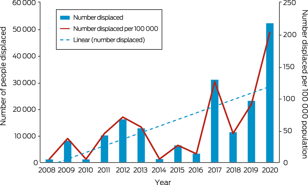 A total of 52 033 people were forcibly displaced by weather‐related disasters in Australia in 2020, including bushfires (n = 47 529), floods (n = 4201), storms (n = 223), coastal erosion (n = 52), and landslides (n = 28).49 There has been an upward trajectory in weather‐related displacement since 2008, even adjusting for population increase (Box 7). Increases in the frequency and intensity of climate and weather extremes are attributed to human‐induced climate change51 and, without further climate change mitigation and disaster risk reduction, will continue to forcibly displace more people and put health at risk across the country.
