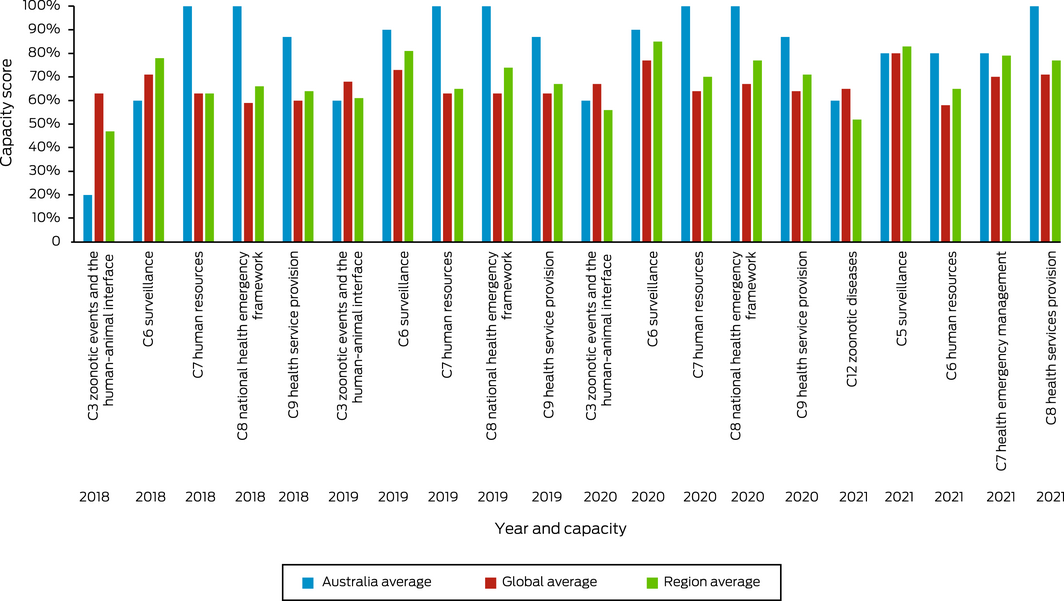 The International Health Regulations (2005)61 (IHRs) are an instrument of international law designed to prevent, protect against, control and provide a public health response to potential public health emergencies and the international spread of infectious disease. With weather and climate causing or contributing to many public health emergencies and the spread of many infectious diseases, the IHRs serve as an important indicator of national climate change and health adaptive capacity. Countries report to the World Health Assembly on the implementation of the IHRs across 13 capacities. For this indicator, we track Australia’s reported implementation of the health emergency management capacity from 2018 to 2021. Australia’s score for this capacity dropped below 100% for the first time in 2021 since it was introduced by the WHO in 2018 (Box 8). For continuity with previous MJA–Lancet Countdown reports,11,12 we also report Australia’s surveillance and public health human resources capacities. The latter dropped below 100% in 2021 for the first time over this period; the former has been below 100% over the 4‐year period, and in 2021 was at 80%. We also highlight that Australia’s zoonotic diseases capacity has been well below 100% over this period, but its health services provision capacity increased to 100% for the first time in 2021 (Supporting Information 2.3). Limitations of the IHRs in ensuring an effective response to the COVID‐19 pandemic have been identified and continue to be evaluated and reviewed. However, countries with higher capacity scores were found to have lower incidence and mortality per 100 000 population within 30 days from first COVID‐19 diagnosis, stressing the relevance of the IHRs.62