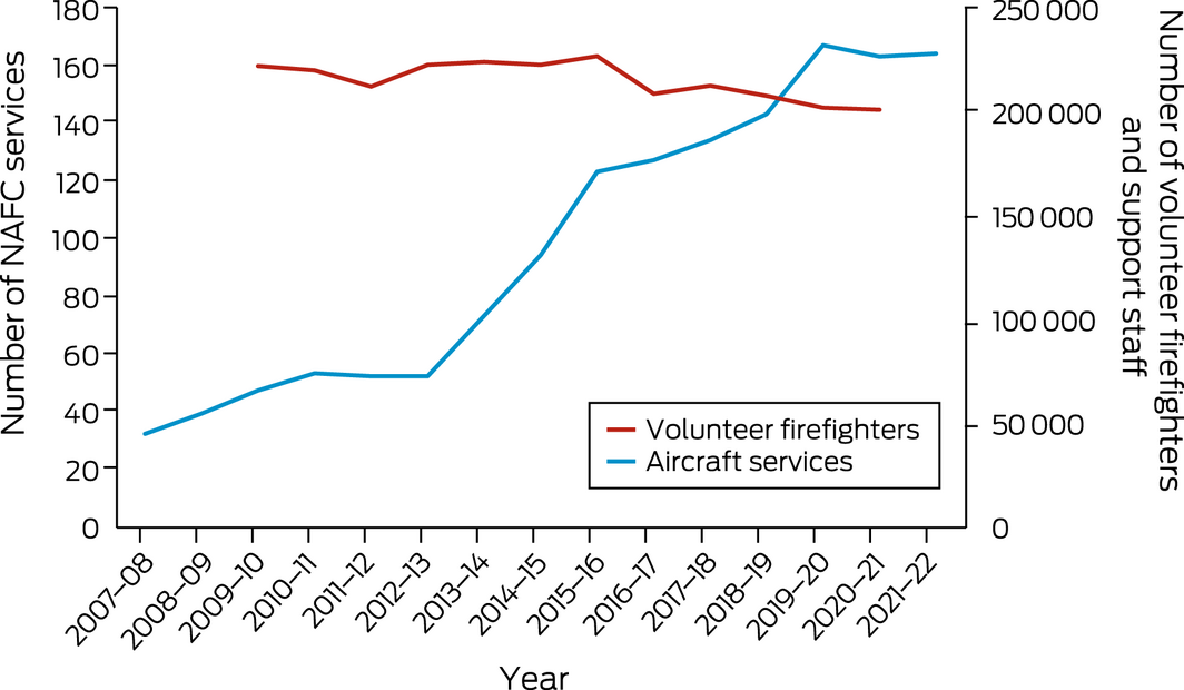 As highlighted elsewhere in this report (eg, indicator 1.3 Bushfires) and in our 2020 report that focused on Australia’s 2019–20 Black Summer,14 bushfires are a major climate‐related extreme event with direct and indirect consequences for human health. To track progress on bushfire adaptation in Australia, we analyse aerial and terrestrial firefighting capacity (Box 9). Although National Aerial Firefighting Centre aircraft services have increased since 2007–08, from just over 30 to the current 164, the number of volunteer firefighters and support staff in Australia has decreased since 2015–16 and is currently at its lowest point since the Productivity Commission started reporting on this area of government services in 2009–10 (Supporting Information 2.4).