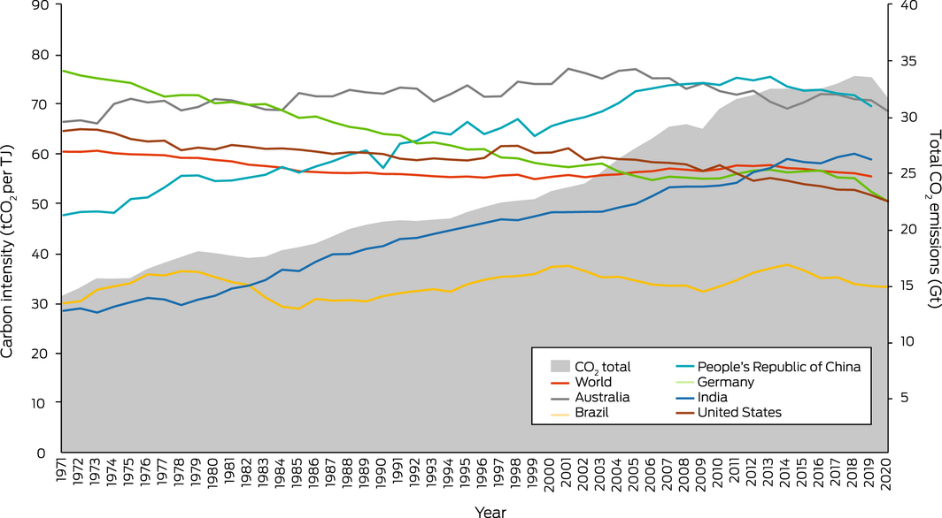 Consistent with our previous reports, we define the carbon intensity of the energy system as “the tonnes of CO2 emitted for each unit of primary energy supplied”.12 Data are now available up to 2020 for Australia, Brazil, Germany and the United States, and up to 2019 for the People’s Republic of China and India (Box 10). The latest data suggest a substantial decrease in the carbon intensity of total primary energy supply during the COVID‐19 pandemic. Despite the decrease in 2020, the carbon intensity of Australia’s total primary energy supply continues to be the highest among the countries analysed and has again surpassed that of China in 2019 (noting that 2020 figures are not yet available for China). However, there is already strong evidence that the COVID‐19 recovery will lead to substantial emission increases in Australia and other countries in future years, with a potentially widening gap expected between countries that were already “greener” before the pandemic and had higher investments in green recovery plans, and those that backed a fossil‐fuel led recovery.66