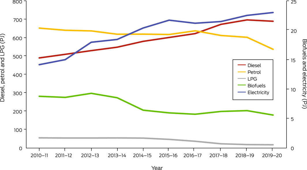 The lockdowns and other non‐pharmaceutical public health interventions during the COVID‐19 pandemic resulted in considerable emission reductions and lower energy use in sectors such as transportation.63 However, these outcomes were short‐lived. Whereas total carbon dioxide (CO2) emissions globally decreased in 2020 owing to the impacts of COVID‐19, there is already substantial evidence that the COVID‐19 recovery might not lead to the lasting drop in emissions that many had hoped for.64 The indicators in this section assess a range of climate change mitigation actions and health co‐benefits in Australia.