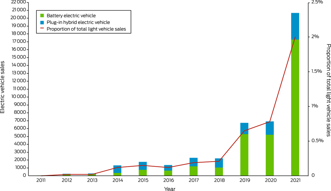 Owing to the impact of the COVID‐19 pandemic, energy use associated with transport has declined for the first time in 20 years. Despite the decline, transport continues to be the largest consumer of energy in Australia.74 Fossil fuels continue to be the predominant fuel for the transport sector, contributing substantially to harmful air pollution levels and greenhouse gas emissions, although electricity use in the transport sector has slowly increased from 2010 to 2020 (Box 12). As shown in Box 13, the sale of electric vehicles (EVs) in Australia has increased considerably in 2021, with sales tripling from 6900 in 2020 to 20 665 in 2021, accounting for a 2% market share of new light vehicles, up from 0.78% in 2020.75 The escalation in EVs in 2021 is, in part, attributed to the fact that Tesla (12 094 vehicles sold in 2021) disclosed their sales figures for the first time.75 However, part of the increased EV sales could be attributed to the proactive stance by all Australian states and territories, which now have strategies to enhance the uptake of EVs, including comprehensive incentive programs such as stamp duty waivers, registration discounts, rebates and interest‐free loans.76 Despite more positive findings compared with previous years, Australia continues to be a long way from achieving sustainable transport, particularly when compared with other Organisation for Economic Co‐operation and Development countries. Proactive policies that encourage the transition to EVs by investing more in EV infrastructure, rebates and national fuel efficiency standards are urgently needed.