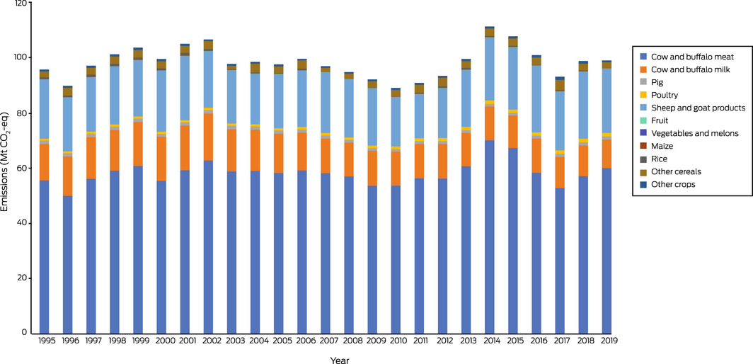 More than 50% of production‐based emissions from agricultural food products stem from cow and buffalo meat production (Box 14; Supporting Information, figure A3), followed by sheep and goat products. Production of fruits, vegetables and melons, rice and maize is much less emissions‐intensive than meat production. From a consumption perspective, red meat and milk consumption are key drivers of emissions in the agricultural sector (Supporting Information, figure A4). Interestingly, there has been a downward trend in per capita red meat consumption in Australia (Supporting Information, figure A5), in part because of an observed shift to environmentally friendly and healthier dietary habits.77