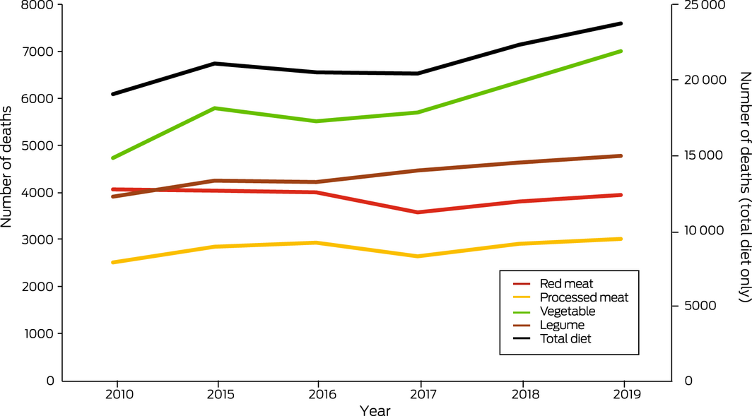 This indicator presents the change in deaths attributable to dietary risks. The Lancet Countdown provided methods, data and results.16 Between 2010 and 2019, all diet‐related deaths in Australia increased by 25%, from 19 030 to 23 728 (Box 15). Inadequate vegetable and legume consumption largely accounts for this increase, although diet‐related deaths related to processed meat consumption also increased over this period. However, high meat consumption is still an important contributor to diet‐related deaths in Australia, with high red meat and processed meat consumption combined accounting for about one‐third of diet‐related deaths in 2019, with the remainder largely accounted for by low vegetable and legume consumption. In line with the Australian dietary guidelines, many lives could be saved in Australia each year by a lowering of population‐level meat consumption and increasing vegetable and legume consumption. Analysis shows that a diet consistent with Australian dietary guidelines had a 42% lower climate footprint than the current average diet of Australian adults.78 Adherence to the dietary guidelines would therefore have the co‐benefit of reducing Australia’s greenhouse gas emissions plus lead to further health benefits.