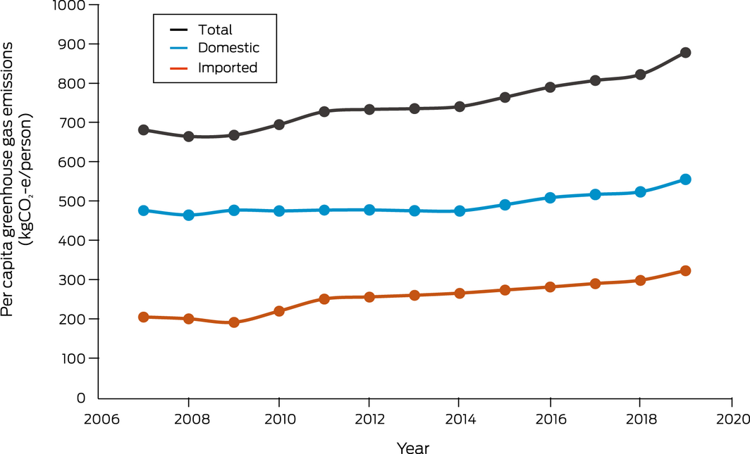 This indicator provides a quantitative assessment of the annual domestic, imported and total greenhouse gas emissions embodied in Australia’s health care sector from 2007 to 2019. This indicator builds on data and methods presented in the 2021 Lancet Countdown report.17 Specifically, the indicator captures emissions of the following gases: CO2, methane, nitrous oxide, nitrogen oxides, sulfur oxides, carbon monoxide, non‐methane volatile organic compounds, and ammonia using an environmentally extended multiregional world input–output database79 coupled with data on health expenditure from the WHO Global Health Expenditure Database80 for calculating consumption‐based impacts.81