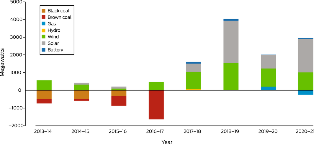 The indicator reports investment in new coal and renewable zero carbon energy‐based generation capacity in the Australian National Electricity Market (NEM). According to the latest report of the Australian Energy Regulator (AER)84 and the Australian Energy Market Operator (AEMO),85 there is no planned investment in new coal‐fired generation, while between 2013 and 2021, over 1300 MW of black coal and 2500 MW of brown coal generation assets have been removed from the market (Box 18). During the same period, over 6000 MW capacity of wind and over 5700 MW of solar generation were added to the NEM. Substantial additional investment in variable renewable energy generation has been committed.