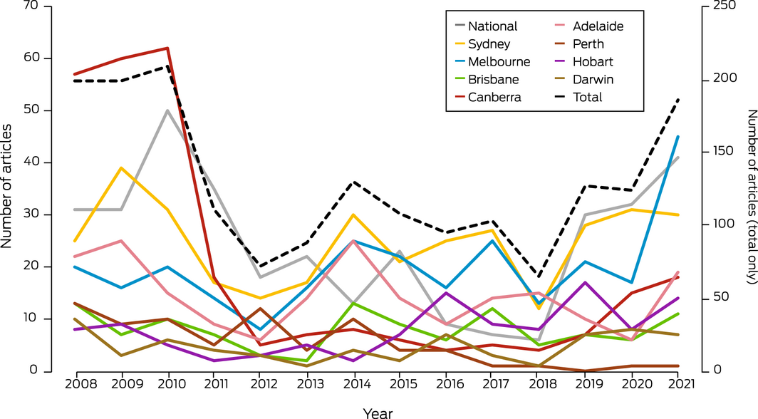 This indicator tracks the national media coverage of health and climate change content. We used the same methods as last year,12 including 13 national and regional high circulation English language newspapers, as well as Australian Broadcasting Corporation (ABC) online news and transcripts in the Factiva media database. The total number of newspaper articles on health and climate change in 2021 (186) was 1.5 times that of 2020 (124) (Box 20). However, the coverage varied greatly according to location, and the increase was mainly observed in Melbourne, Adelaide, Hobart and Brisbane. The lowest coverage of the topic has been in Perth since 2019. Of these articles, 71% mentioned “pandemic” in the context of health and climate change. The ABC online content on health and climate change in 2021 also slightly increased compared with 2020 (Supporting Information, figure A7). This indicates that media attention to climate change and health topics has increased despite the ongoing fight against the COVID‐19 pandemic. However, there was still a low number of articles on how to adapt to a changing climate to reduce the health consequences.
