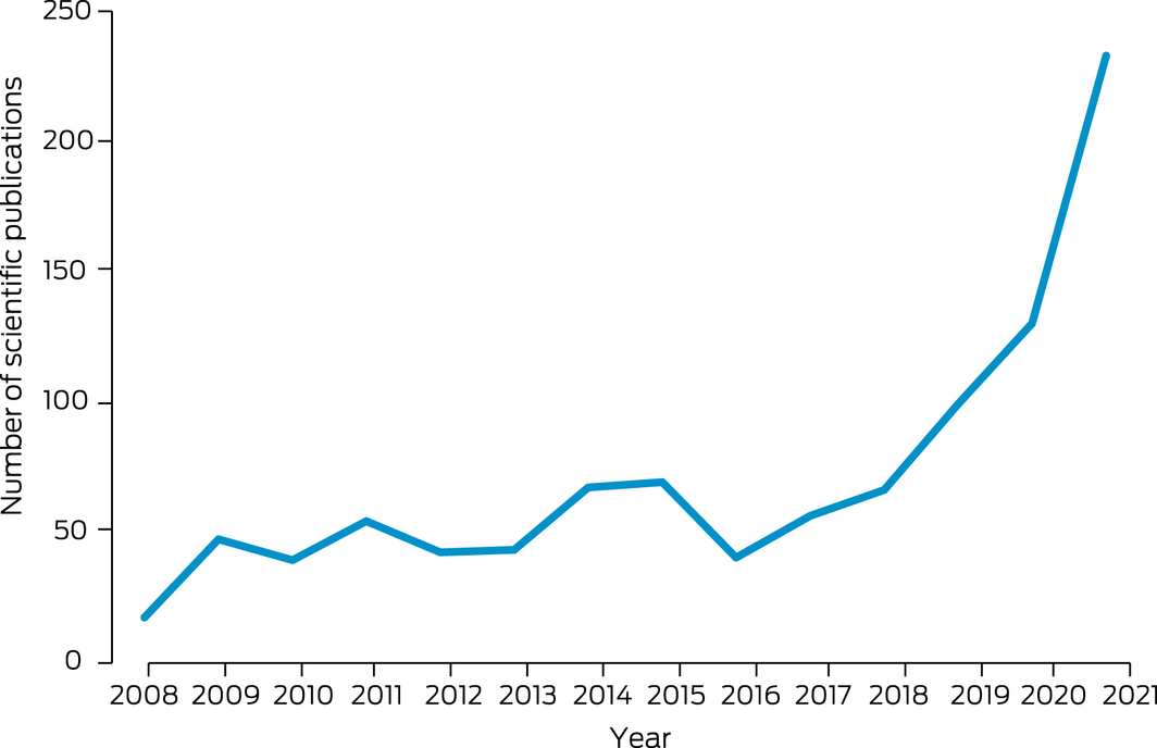 This indicator continues to track scientific publications on health and climate change in Australia, using the same methods as last year, using the Scopus database.12 Our findings show a surge in the number of publications in 2021, with 233 new scientific publications on health and climate change. This represents a 79.2% increase on 2020 (130) and a 13.7‐fold increase compared with the number of publications in 2008 (17) (Box 21). Original research articles accounted for 54.5% of the total publications (127 of 233 publications). There was an increased number of literature reviews and editorial articles published in 2021 compared with 2020. Less than half of the 2021 publications (108, 46.5%) were in medicine, with increasing studies in other disciplines. Most studies focused on health impact assessments, with fewer studies on mitigation and adaptation. Heat and bushfire were the most focused exposures, whereas mental health and infectious diseases were the most studied health outcomes. There were 17 studies that examined the link between COVID‐19 and environmental and climatic factors.