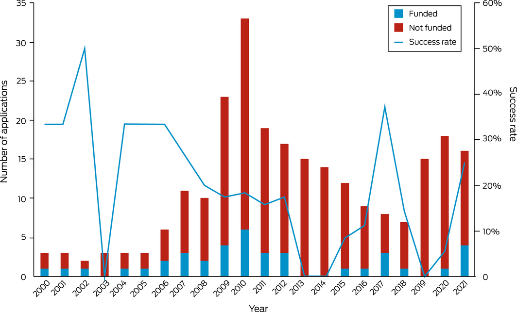 Research on health and climate change in Australia is fundamental to Australia’s understanding of and response to this critical issue. This indicator tracks the annual number of funded and not‐funded NHMRC health and climate change grant applications from 2000 to 2021 (Box 22). The most recent year (2021) saw a continued reversal of the downward trend in health and climate change grant applications that occurred from 2011 to 2018, with a total of 16 applications. In an important advance over the previous two years, the success rate in 2021 was very good (25%), with the four applications funded being the equal second highest number of annual applications that have been funded in this field over this 22‐year period. It is also noteworthy that a 5‐year, $10 million NHMRC Special Initiative in Human Health and Environmental Change was funded in 2021.95 This is a landmark in research funding in the health and climate change field and the resulting Healthy Environments And Lives (HEAL) Network is expected to boost research capacity and capability across the country in the coming years (Supporting Information 5.4).