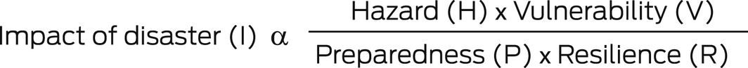 The impact of a disaster is determined by three factors: the hazard itself (an extreme event that can be natural or man‐made), the vulnerability of the affected people, and the capacity or measures that can be taken to reduce or cope with the potential negative consequences. A disaster occurs when the hazard exposes the vulnerability of individuals and communities in such a way that their lives are directly threatened, or sufficient harm has been done to their community’s economic and social structure to undermine their ability to survive. Harm can be defined as loss of life, injury, disease, and negative effects on human physical, mental and social wellbeing, together with damage to property, destruction of assets, loss of services, social and economic disruption, and environmental degradation. Vulnerability refers to the person’s or population’s susceptibility to be harmed and their capacity to anticipate, cope with, and recover from the impact of a hazardous event.2 Importantly, vulnerability is not uniform and is determined by access to economic and material resources, human or personal resources (such as education), family and social resources (such as networks of reciprocity), and political resources (such as power and autonomy). The more general the disaster, the more likely disadvantaged communities will suffer.3,4,5,6 Mitigating factors that reduce the potential impact include prevention measures, community preparedness, and resilience. Once a disaster occurs, its impact can be determined by applying the following formula: