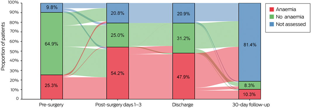 Results: Data were available for 2730 eligible patients (mean age, 56.7 years; SD, 17.3 years), including 1558 women (57.1%). Haemoglobin levels prior to surgery were documented for 2461 of 2727 patients (90.2%), 689 of whom had anaemia (28.0%). Pre‐operative anaemia assessment and management were associated with lower likelihood of intra‐operative (adjusted odds ratio [aOR], 0.33; 95% CI, 0.19–0.57) and post‐operative blood transfusion (aOR, 0.36; 95% CI, 0.25–0.53), and of post‐operative complications (aOR, 0.79; 95% CI, 0.63–0.99). Tranexamic acid was administered during 128 of 2728 procedures (4.7%); a restrictive transfusion strategy was followed for 96 of the 167 patients who received post‐operative blood transfusions (58%). Post‐operative anaemia was identified in 1227 of 2069 patients (59.3%) in whom haemoglobin was assessed prior to discharge. The proportion of people re‐admitted to hospital within 30 days was larger for patients with anaemia at discharge (169 of 1207 patients followed up, 14.0% v 61 of 825, 7.4%). Haemoglobin assessments were recorded by 30 days after discharge for only 288 patients with post‐operative anaemia (24.3%).
