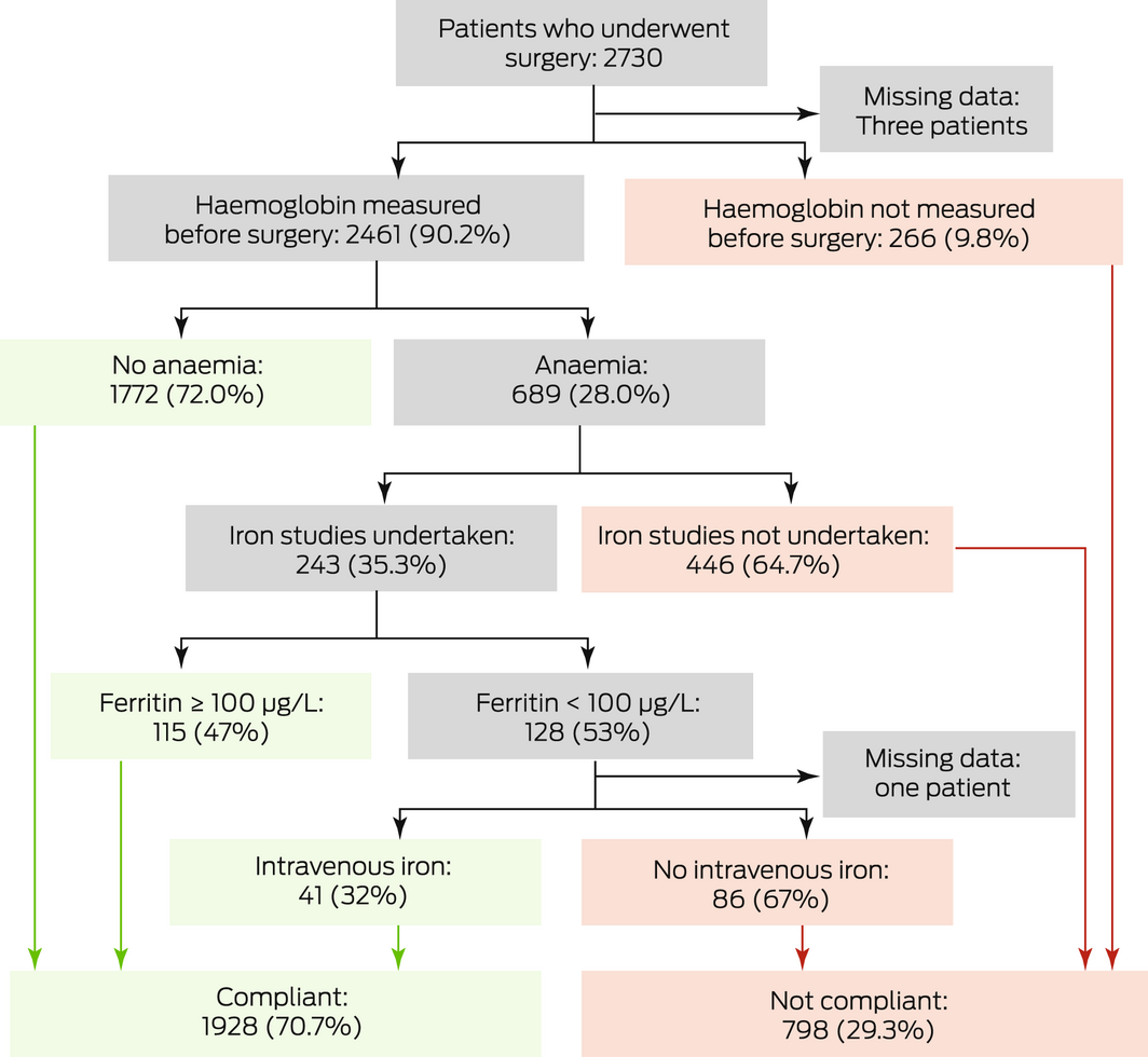 National health authorities in Australia and New Zealand have adopted consensus guidelines for blood management in patients undergoing surgery.3,13 The per capita use of intravenous iron in Australia is among the highest in the world, causing costs to the Pharmaceutical Benefits Scheme of more than $110 million annually.14 We found that haemoglobin was assessed in 90% of patients before abdominal surgery, and that iron studies were undertaken for 35% of those with anaemia. Adherence to individual components of the audit standard varied with operative urgency, reflecting the impracticality of iron studies in patients requiring acute surgery. Although the pre‐operative use of intravenous iron has been widely discussed,6 it is relatively uncommon in Australia and New Zealand, including in elective surgery.
