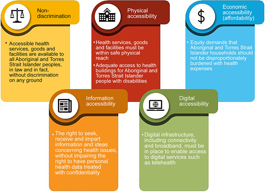 In addition to the existing four accessibility dimensions in the AAAQ framework, digital accessibility (and the digital determinants of health) also needs consideration for comprehensive Indigenous health equity planning (Box 2).13,14,15 Telehealth is becoming more permanent in Australia,16 and exploring opportunities for improved digital accessibility has potential to mitigate accessibility barriers to certain health services for Indigenous people living in rural, remote and very remote Queensland, if telehealth is what the local community wants. In examining questions of digital accessibility and availability, multijurisdictional issues will arise; the Australian Government is responsible for National Broadband Network roll‐out in all states and territories, not the Queensland Government.17 Additionally, acceptable and quality telehealth service provision to and with Indigenous communities will be key, and local community guidance is crucial to inform what this might look like in practice.