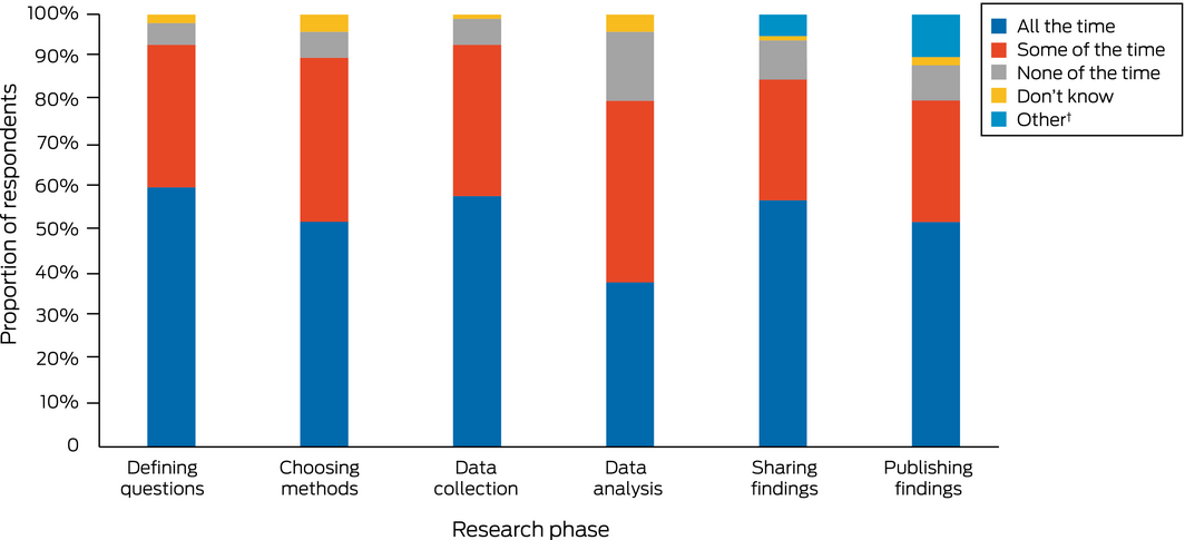 Indigenous participation was infrequently reported for the data analysis phase of research (“all of the time”: 38%). Information is informed by the context in which it is generated, collected, analysed, and shared. The risks of data analysis without community oversight or control have been recognised by Indigenous scholars who advocate Indigenous data sovereignty to offset views of Indigenous people that reflect what has been characterised as “5D data” (dominated by disparity, deprivation, disadvantage, dysfunction, and difference); the “primary problematic is that the Indigenous ways of seeing the world are not doing the shaping”.22 While Indigenous leaders have called for greater investment in Indigenous statistical capacity,23 only 32 people (13%) in our survey had received formal education in Indigenous data governance and sovereignty. This suggests that a significant proportion of data analysis is undertaken by people and research teams not familiar with Indigenous governance and data sovereignty principles, leading to publications that reflect Western scientific paradigms at the expense of Aboriginal and Torres Strait Islander world views.24