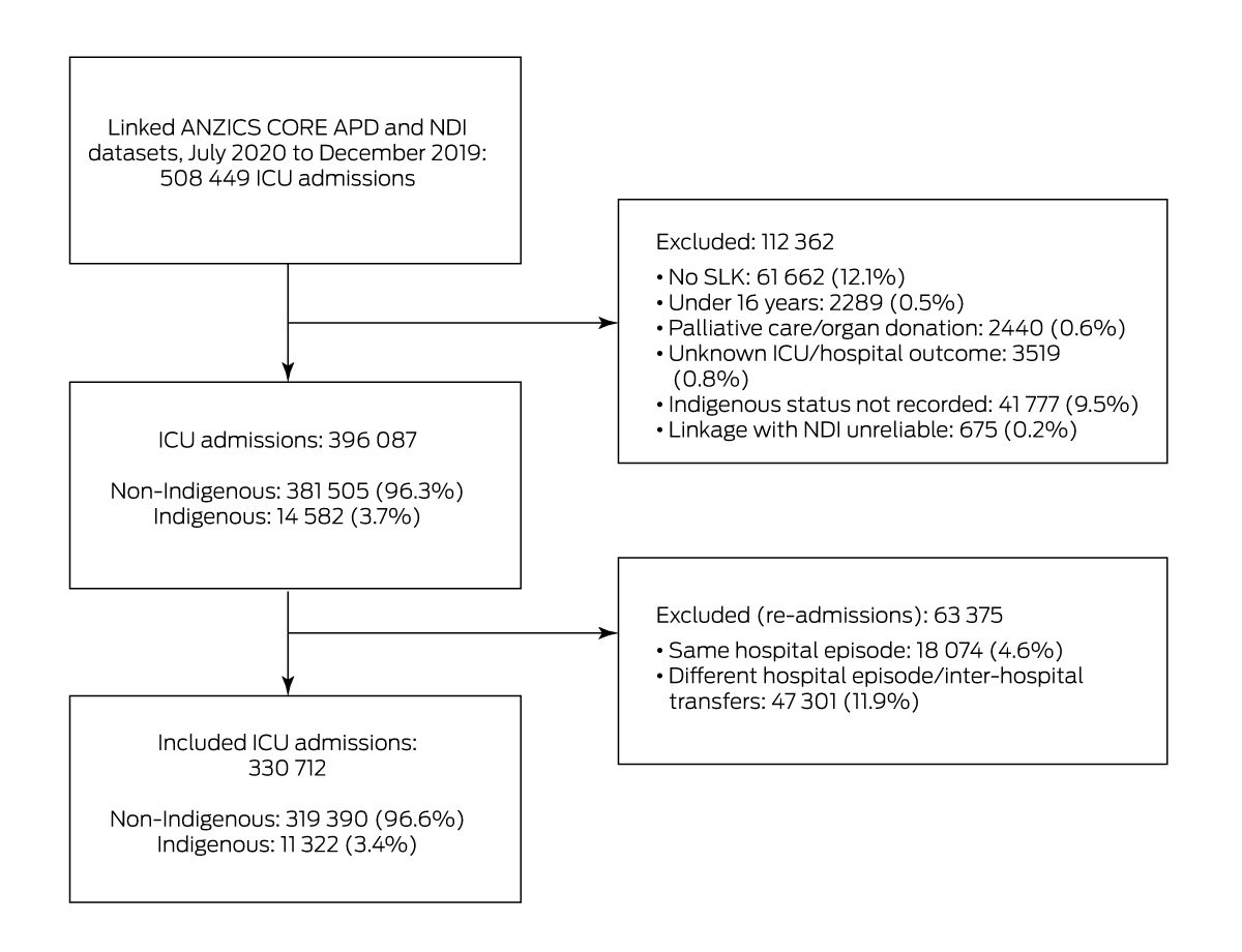 However, the relatively recent introduction of the SLK‐581 meant that we could match APD data to NDI data only from 2017, although this also means that our findings reflect contemporary ICU treatment and management of chronic conditions. Second, we could not assess pre‐hospital factors (eg, functional status), living arrangements, or health care access and use. Third, database analyses are limited by the variables included in the databases. Neither the APD nor the NDI include patient‐reported outcomes, such as quality of life, or data on risk factors for health service use, including availability of family and other social support. Fourth, we could not account for patients lost to follow‐up because of migration. Fifth, we excluded 35% of ICU admissions in the APD database, including 9.5% for which the Indigenous status of the patient was not recorded (Box 1). Sixth, as we included data only for index admissions, we may have underestimated mortality among patients transferred to other ICUs; however, the degree of concordance between the APD and NDI for inpatient deaths means the extent of this problem was probably minor. Seventh, the scores we used to adjust for illness severity were calibrated using broad datasets, not for specific subgroups, such as Indigenous people.