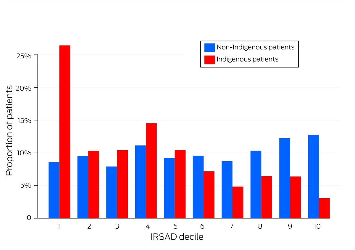 * 315 866 non‐Indigenous, 11 165 Indigenous patients for whom residential postcode could be mapped to IRSAD decile. The raw data for this figure are included in Supporting Information, table 3.