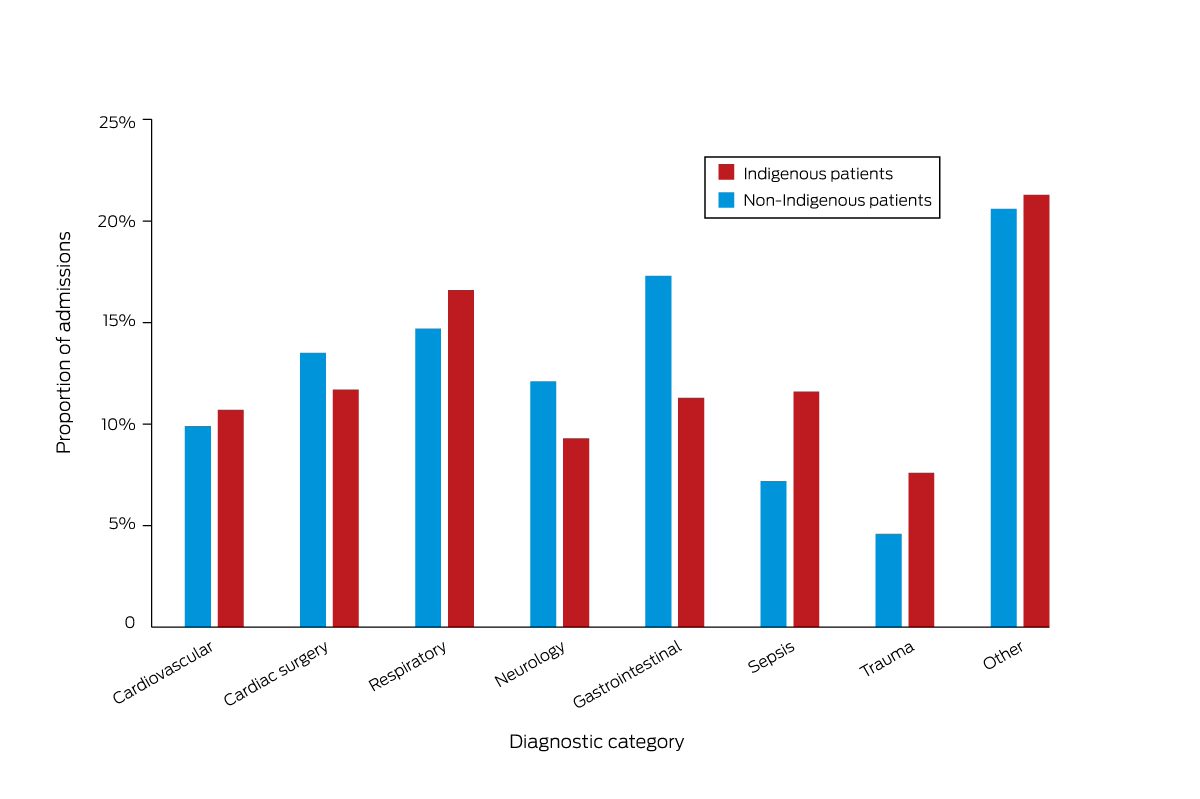 The proportions of people admitted because of sepsis (11.6% v 7.2%), respiratory illness (16.6% v 14.7%), or trauma (7.6% v 4.6%) were larger for Indigenous than non‐Indigenous patients (Box 4). The proportion who were mechanically ventilated was larger for Indigenous patients (40.3% v 31.7%), and the median APACHE III illness severity scores were similar, but the median age score was lower for Indigenous patients (Box 3).