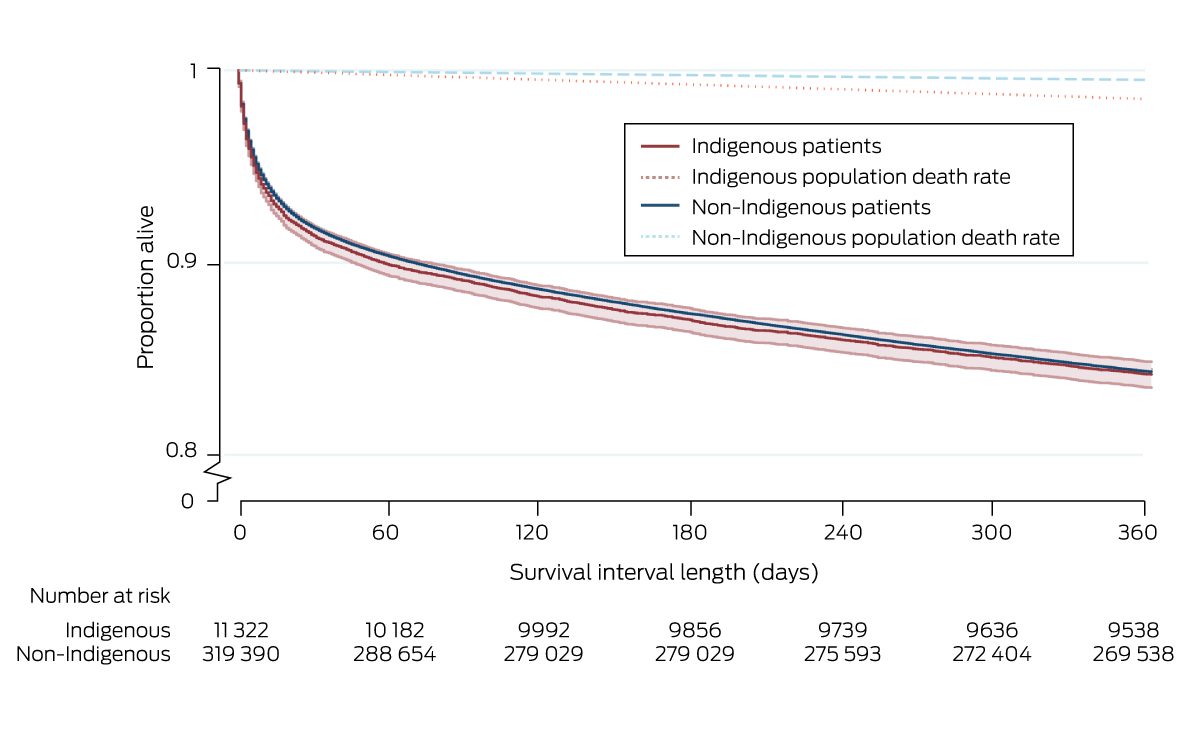 The higher adjusted mortality among Indigenous than non‐Indigenous patients twelve months after admission for ICU care is disturbing, and why the median age of Indigenous people who require ICU care is 15 years lower than for non‐Indigenous patients is unclear. Possible explanations include more rapid disease progression and restricted access to pre‐ and post‐ICU care in public and primary health care. Each possibility warrants further investigation. It was recently reported, for example, that intensive post‐ICU management improves outcomes for people successfully treated for sepsis.27