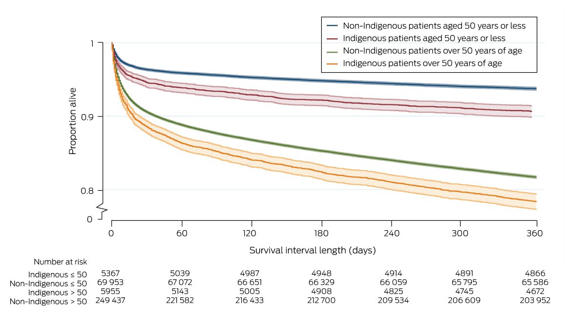 Survival time is depicted in Kaplan–Meier curves, and between‐group differences were assessed in log‐rank tests. Longer term mortality was referenced to Australian Bureau of Statistics age‐ and sex‐matched life tables for the non‐Indigenous and Indigenous populations (5‐year blocks).23 Analyses stratified by age are reported in similar fashion.
