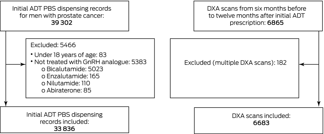 Men (18 years or older) with prostate cancer who commenced ADT during 1 May 2017 – 31 July 2020 were identified in the Pharmaceutical Benefits Scheme (PBS) database by PBS code (, table 1). DXA scans from six months before to twelve months after initial ADT dispensing were identified in the Medicare Benefits Schedule (MBS) database by MBS item number (, table 2). After linking the de‐identified PBS and MBS datasets using patient identifier codes, we also extracted socio‐demographic information (age, state of residence) for the included men.