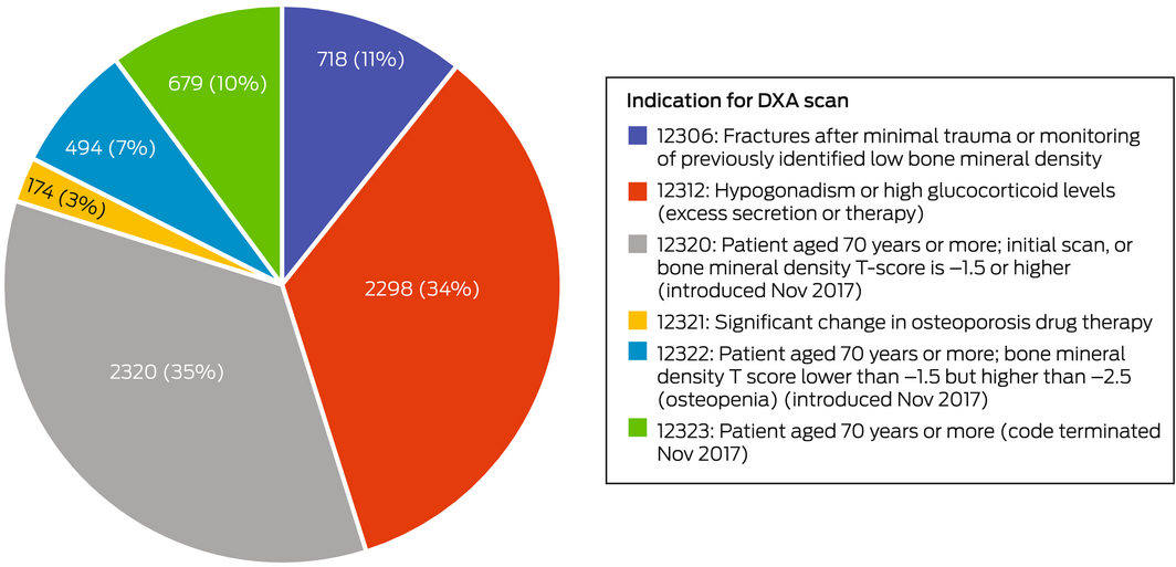 The MBS item indications for 3493 DXA scans (52%) were age‐related (ie, for men aged 70 years or more; MBS items 12320, 12322, 12323); the indication for 2298 scans (34%) was bone health assessment in men with hypogonadism or glucocorticoid excess (MBS item 12312) (Box 2). Age‐related scans comprised a larger proportion of scans before than after ADT initiation (936 of 1339, 69.9% v 2557 of 5344, 47.9%; , table 3), while item 12312 scans comprised a larger proportion of scans after than before ADT initiation (2120 of 5344, 39.7% v 178 of 1339, 13.3%).