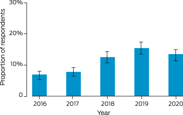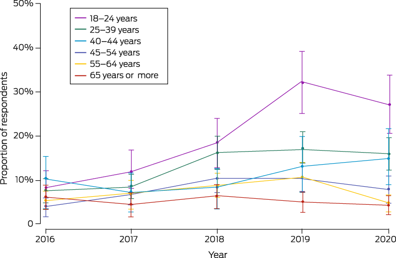 The proportions of 18–24‐year‐old and 25–39‐year‐old respondents who used e‐cigarettes increased between 2016 and 2020, but not those of respondents aged 40 years or more. The proportion of people aged 18–24 years who reported e‐cigarette use increased from 18.4% (95% CI, 12.9–23.9%) in 2018 to 27.2% (95% CI, 20.5–33.9%) in 2020, a larger proportion than for any other age group (Box 5).