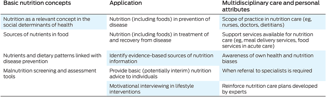 - 10. Nowson C, Roshier‐Taks M, Crotty B. Nutrition competencies for the prevention and treatment of disease in Australian medical courses. Med J Aust 2012; 197: 147. https://www.mja.com.au/journal/2012/197/3/nutrition‐competencies‐prevention‐and‐treatment‐disease‐australian‐medical