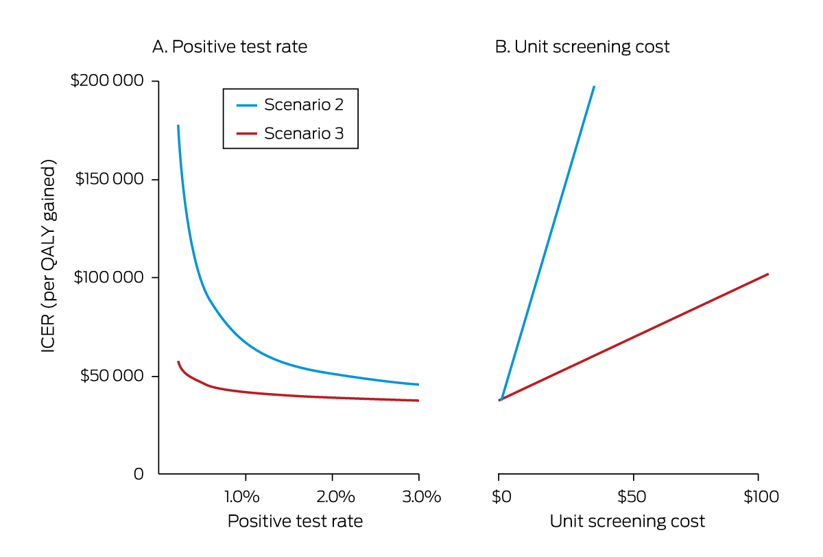 The cost‐effectiveness of scenarios 2 and 3 increased with test positivity rate; rates of 2.26% (scenario 2) or 0.35% (scenario 3) were required to achieve an ICER of $50 000 per QALY gained (Box 2, Box 3).